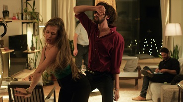 While the film’s poster looks like a conventional heavy-kissing romance, the above still, from the more intriguing third section about intimacy, features the main character “Avishag” (played by the director’s friend Elisheva Weil) with “Dror” (played by Yoav Hait), the older client of her dog-walking business, to whom she is more attracted than to the young man (played by the actress’s actual boyfriend Leib Levin) in the middle chapter with whom she has explicit sex. I was surprised that the cinematographer Meidan Arama and editor Or Lee-Tal are both male.