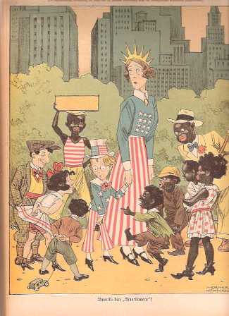 Left - “America for the ‘Americans’!” by Werner Hahmann, 1934, Issue #23 of Berlin’s satirical Kladderadatsch (From Prof. Randall Bytwerk’s German Propaganda Archive at Calvin College). This cartoon promotes a Nazi caricature of a Jewish female (lower left) that still dominates in movies and TV, with her mocking mouth, dark curly hair, immodest dress -- the “impudent behavior of Jewish women” that Nazis objected to in the mid-1930’s. (Quote in Saul Friedlander’s Nazi Germany and the Jews: Vol 1: The Years of Persecution 1933-1939, 1997, Harper). While the minstrel show images of African-Americans have been discredited as racist “Negrobilia”, so called by Whoopi Goldberg, she culturally appropriated a transgressive stage name and misunderstands the history of antisemitism.