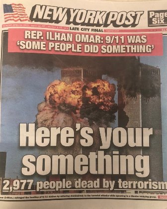 Congresswoman Ilhan Omar (D-Minn.), the subject of Time For Ilhan (seen at 2018 Tribeca Film Festival), and one of the two first Muslims in the House of Representatives, was the target of this nasty poster evidently produced by an anti-Muslim hate group and displayed in the West Virginia State Capitol rotunda on March 1, 2019 on “WVGOP Day”, sponsored by the state Republican Party. Not coincidentally, the Somali-born, hijab-wearing woman of color (Congress passed new rules to permit her religious head-ware) is also being attacked for anti-Israel/Israel lobby comments that are perceived as anti-Semitic. Worse, the President of the United States on 4/13/2019 tweeted a video version with out-of-context quotes from the Congresswoman speaking on the bias against Muslim-Americans after the attacks pic.twitter.com/VxrGFRFeJM with the caption: “WE WILL NEVER FORGET!”, buttressed by the Murdoch-owned New York Post cover that spurred Yemini bodegas’ reaction: